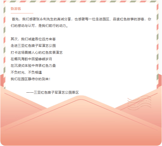 近日,我们收到了一份特别的来稿。游客张永利先生与家人到访三亚红色娘子军演艺公园景区后,写下了这篇情真意切的观演感悟。字里行间,有震撼,有感动,更有对红色精神的深切敬意。下面,就让我们一起通过他的文字,感受这场跨越时空的红色之约。